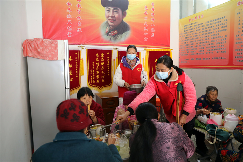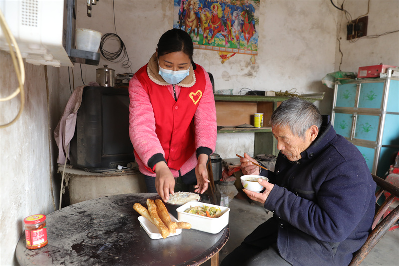 曾洲村三組五保戶余培付接過愛心早餐說:"她們跟雷鋒一樣,經常幫助我,早晨送早餐,我過得很幸福!"
