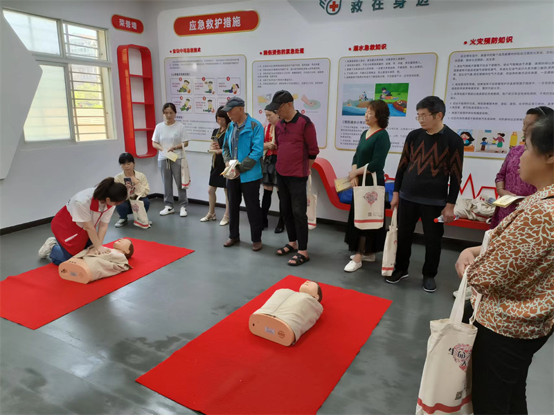 活動現場,紅十字會應急救護師資針對社區留守老人多的特點,結合專業的醫學知識、豐富的救護經驗和日常生活中的救護誤區,用通俗易懂的語言向居民介紹了心肺復蘇、異物梗阻急救等知識,借助人體模型耐心指導居民進行實際操作練習,掌握急救要領。