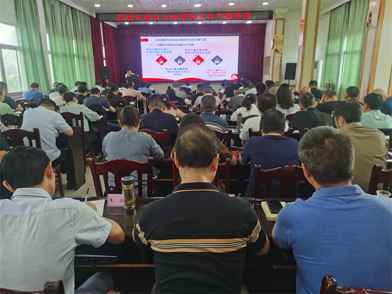 市委政法委專家徐濤以《市域社會治理現代化工作思考與實踐》為題,從深刻理解市域社會治理現代化的深厚內涵、準確把握我市推進市域社會治理現代化的創新實踐、抓實抓細試點城市創建重點工作中的任務三個方面,全面系統闡述了市域社會治理現代化的豐富內涵,并結合實際深入介紹了我市推進市域社會治理現代化的總體思路。