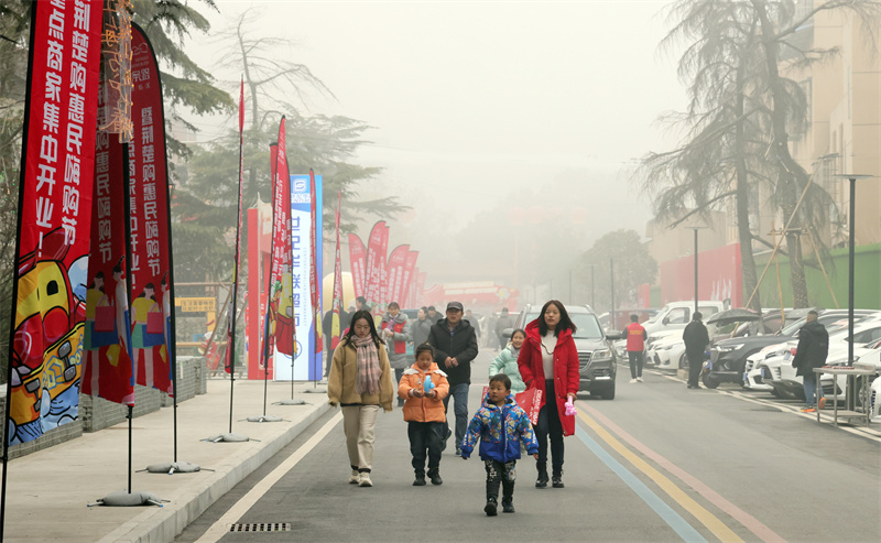當天,在荊楚購·暖冬跨年迎新季活動現場,板鴨、葛粉、楚貢酒等宜城特色優品現場展銷,火爆開賣。五條路創意街區兒童游樂、酒吧、民宿、超市等開業促銷。