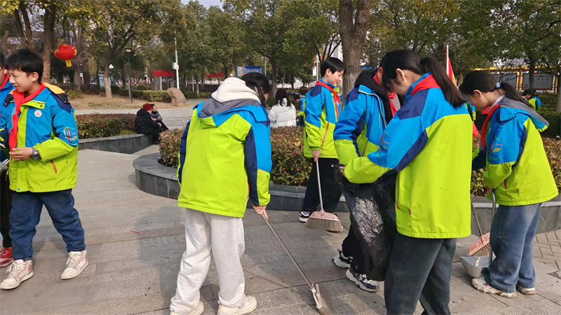 啟動儀式結束后,教師志愿者帶領學生們走出校門,手持垃圾袋和抹布前往楚都公園。在公園里,學生志愿者們有的用抹布擦拭公園的健身器材、有的用掃帚打掃地上的垃圾、有的將亂停的電動車擺放整齊。小小志愿者們不怕臟、不怕累的行事作風,贏得了環衛阿姨和路人們的一致好評。