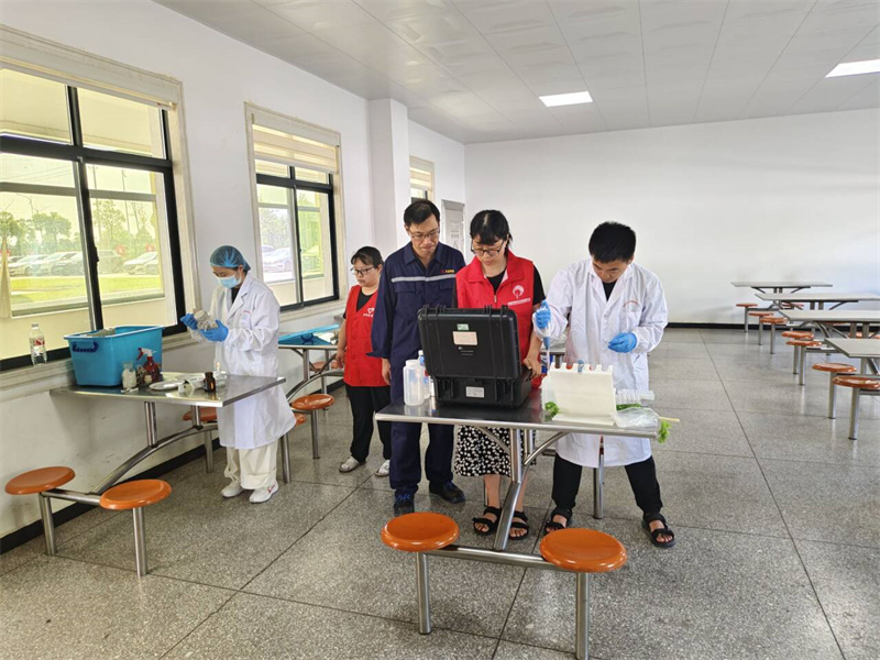工作人員參觀了天舒藥業產品研發中心的實驗室。在參觀過程中,雙方就實驗室建設問題進行交流和探討。同時,公檢中心的技術人員對企業食堂的餐飲具、食材分別進行微生物檢驗和食用農產品農藥殘留快速檢測,為企業員工的食品安全提供保障。
