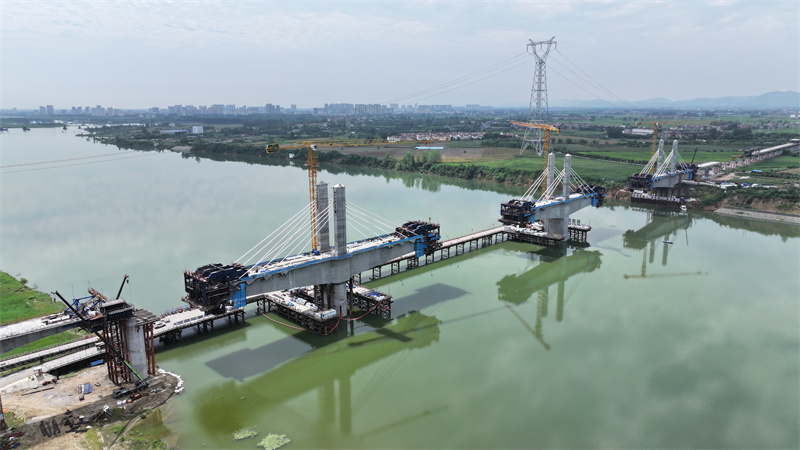 宜城漢江特大橋全長約25.5千米,跨漢江航道主橋長576米,是襄荊鐵路重點控制性工程,也是全線施工難度最大的橋梁。記者在項目施工現場看到,工人們正堅守一線,戰高溫、保進度,穩步推進工程建設。