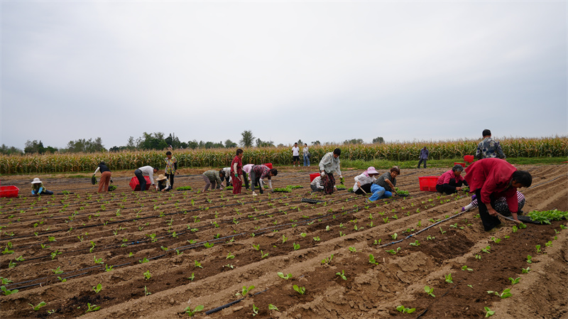 村民熱火朝天的移栽白菜