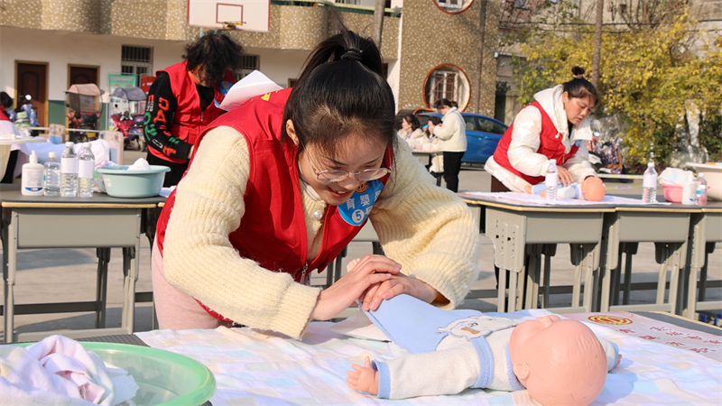 在育嬰項目比賽中,參賽選手為嬰兒洗澡、穿衣,展示衛生保健護理、嬰兒嗆奶急救等技能。競賽中,選手們沉著冷靜、依規操作,展現出熟練的實踐操作技能。