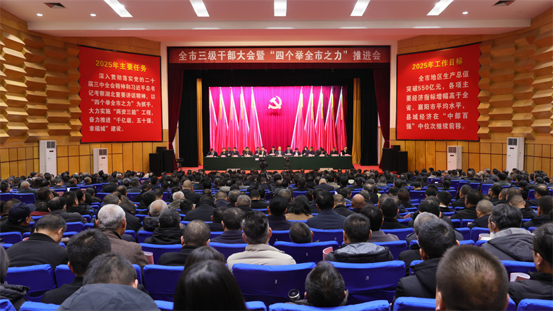 本網訊記者周波 李勤報道:2月8日,宜城市召開全市三級干部大會暨“四個舉全市之力”推進會,深入貫徹落實黨的二十屆三中全會精神和習近平總書記考察湖北重要講話精神及省、襄陽市“新春第一會”精神,總結2024年工作,部署2025年任務。宜城市委書記武義泉參加會議并強調,全市黨員干部和社會各界人士要從“年味”回歸“崗位”,把“過年模式”切換到“戰斗狀態”,以“四個舉全市之力”為抓手,大力實施“兩資三能”工程,加快宜城“千億級、五十強、幸福城”建設,奮戰“開門紅”,誓奪全年“滿堂彩”,奮力譜寫中國式現代化宜城新篇章!