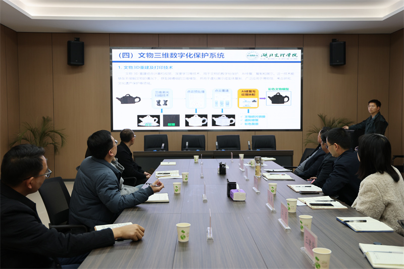 隨后,宜城市委組織部、市文旅局、易澤林工作室與湖北文理學院博士團隊開展座談交流。座談會上,雙方詳細介紹了各自發展概況和供需情況,宜城市介紹了市博物館數字化工程發展規劃、進展情況和技術、人才需求,湖北文理學院博士團隊展示了團隊在智能識別等領域的技術研究與應用場景,重點介紹了借助算法實現文物3D掃描與建模、AI識別與修復、虛擬展示與交互等核心技術,對通過3D打印推動楚文化文創產品開發、培養輸送文物保護事業專業技術人才等關鍵議題進行深入探討交流。