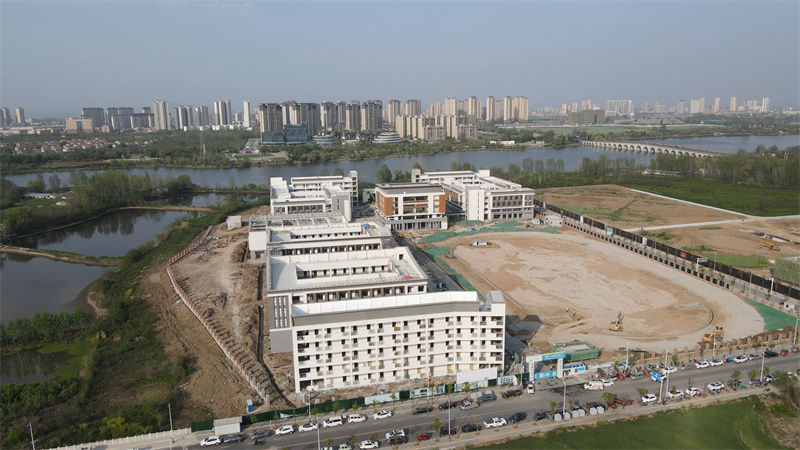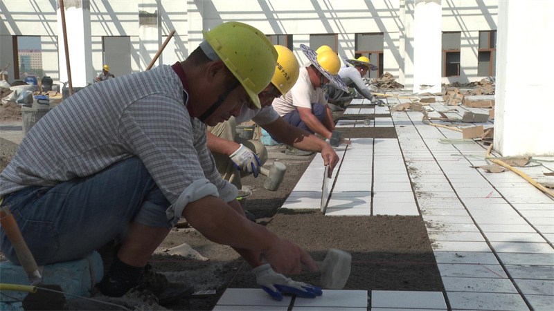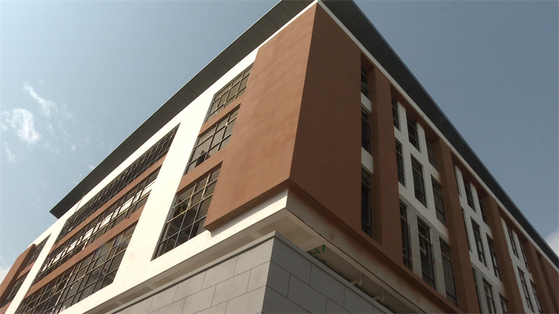 走進鯉魚湖中學項目工地,一棟棟學生宿舍樓、圖書館、教學樓被粉刷工人噴上環保真石漆,在陽光的照耀下熠熠生輝。