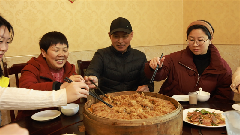“過年從外地回來了,今天家人們在一起聚餐,吃到了我最喜歡的蒸籠格子,這種感覺真好。”流水鎮黃灣村村民胡倩茹說。