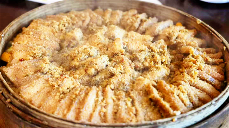 近日,記者走進流水鎮黃灣村,當地一家農家樂的廚師正在廚房里忙碌地準備著蒸籠格子。只見她將新鮮的五花肉、排骨、南瓜、白菜等食材依次切好,隨后加入姜末、花椒粉、食用鹽、醬油等調料攪拌均勻,分層碼放在特制的蒸籠里,再撒上蒸肉粉后放入大鍋中用猛火蒸熟。經過這樣的烹制,肉類鮮嫩多汁,配菜吸收了肉香,變得軟糯香甜,每一口都充滿了濃郁的鄉土氣息。