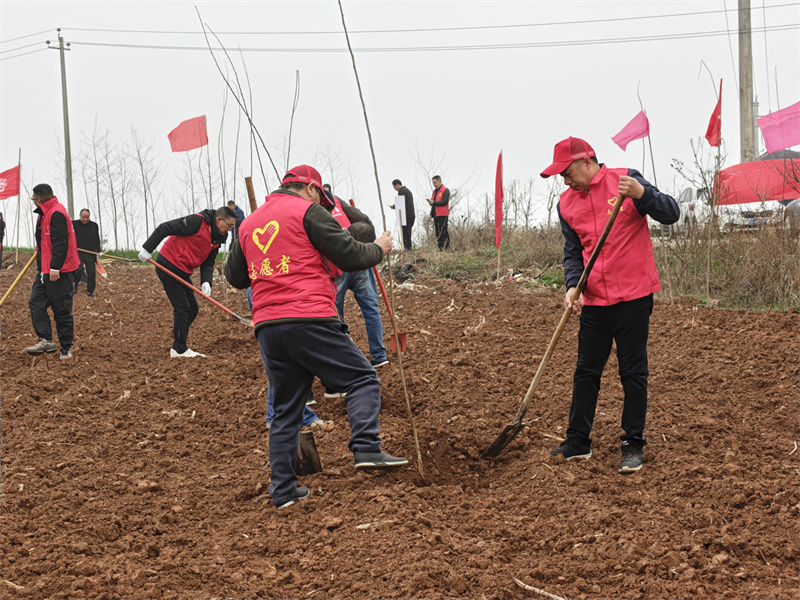 植樹現場,工作人員分工協作,揮鍬挖土、扶正樹苗、覆土培實,現場一片熱火朝天的勞動景象。在大家的齊心協力下,300余株樹苗迎風挺立,煥發出勃勃生機。